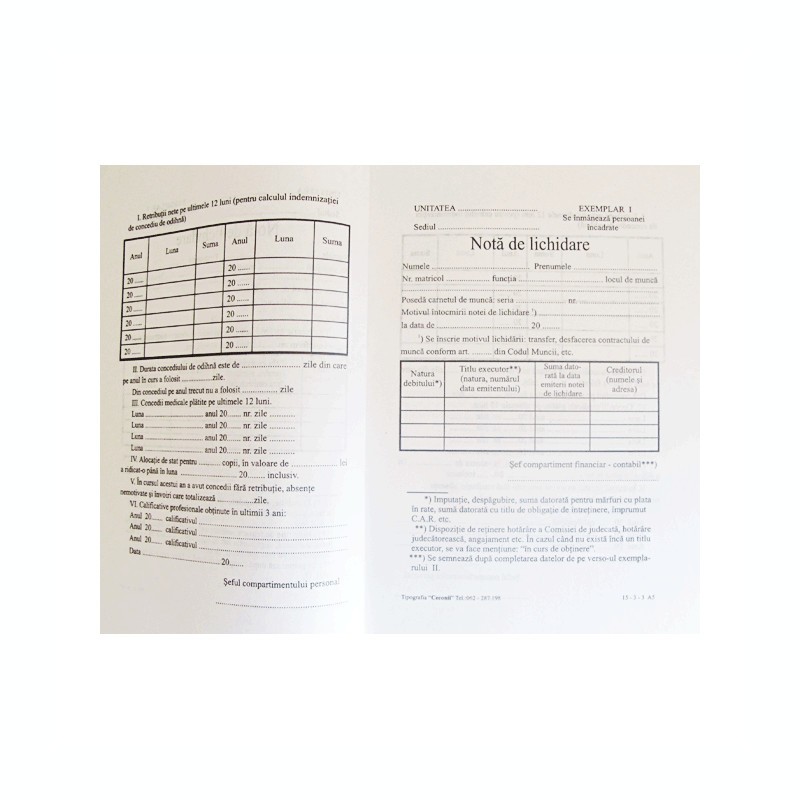Nota de lichidare este un formular tipizat, ce are formatul A5 cu orientare portret. Blocul de note de lichidare contine un numar de 100 file, neinseriate. Formularul este tiparit fata-verso, alb-negru, pe hartie offset de 54g/mp, intr-un singur exemplar. Blocul de note de lichidare are coperta alba si este capsata.