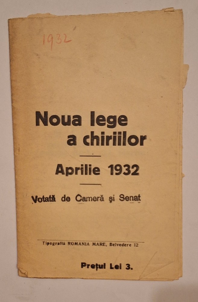 Noua lege a chiriilor – Aprilie 1932 – Tipografia România Mare, București