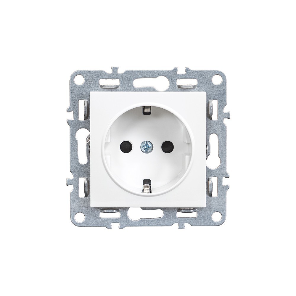 Priza de împământare Nova are o putere nominală de 16A/250V și este proiectată pentru conexiuni de rețea monofazate, împământate, în conformitate cu tipul F (Schuko). Este adecvată pentru conectarea în siguranță a aparatelor electrice de uz casnic și de birou, în special pentru consumatorii de putere mai mare (de exemplu, aspiratoare, aparate de bucătărie, echipamente informatice). Produsul are un design încastrat și poate fi montat într-o cutie de montaj de dimensiuni standard prin fixare cu șuruburi. Modulul fără ramă este compatibil cu sistemele modulare și poate fi montat în mai multe rame. Protecția IP20 înseamnă că acesta poate fi utilizat numai într-un mediu interior uscat, fără praf (de exemplu, cameră de zi, dormitor, birou). Cablarea electrică trebuie efectuată de un electrician calificat și în conformitate cu specificațiile tehnice relevante.