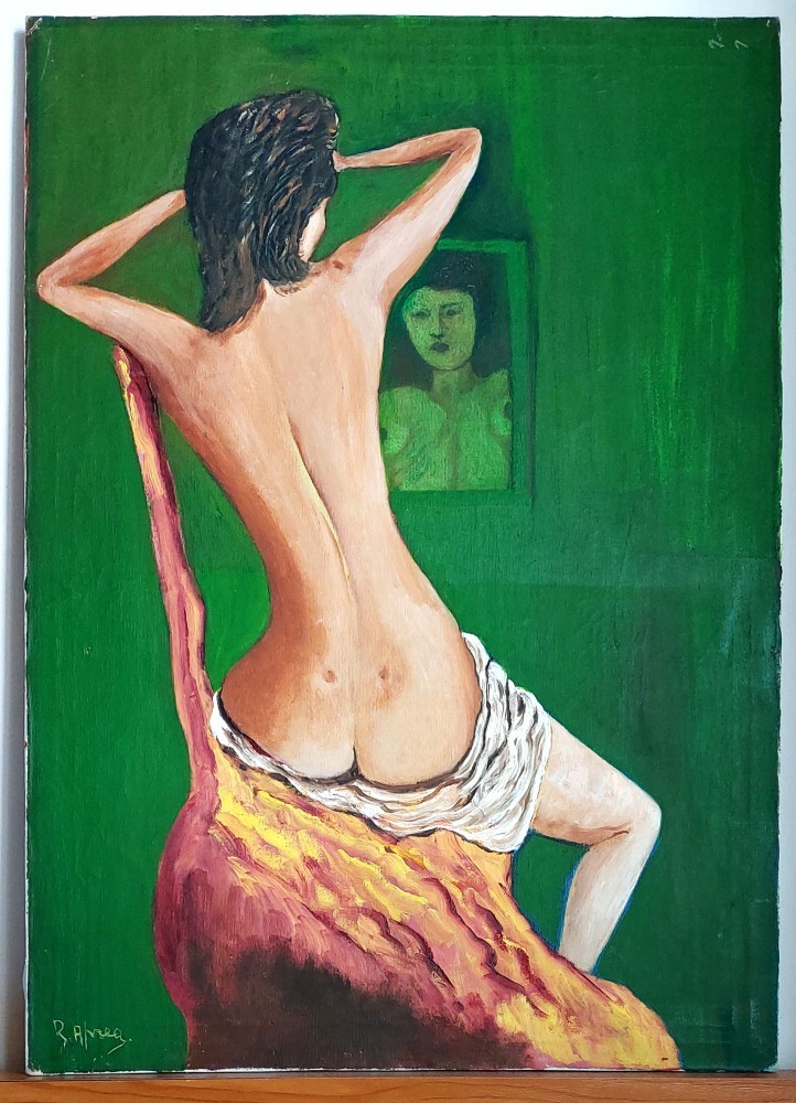 „Nud in oglinda" - pictura naiva in acrilic pe panza (cu sasiul de lemn original), semnata in coltul din stanga jos. Dimensiuni: 50 cm x 70 cm.