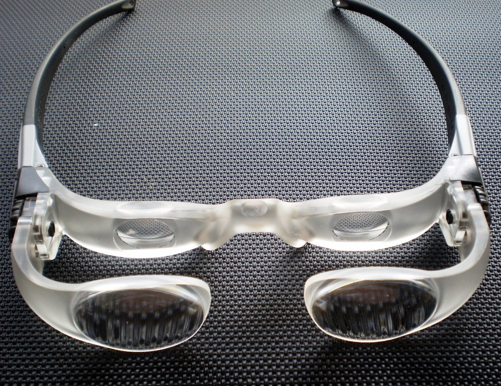 Ochelarii sunt în stare foarte buna, foarte usoarele urme de pe lentile neinfluentand calitatea vederii/citirii. Cele 2 rozete laterale regleaza bine distanța (focuseaza). Distanța aproximativa intre cele 2 axe optice este de 6,5cm. Etui protecție inclus.