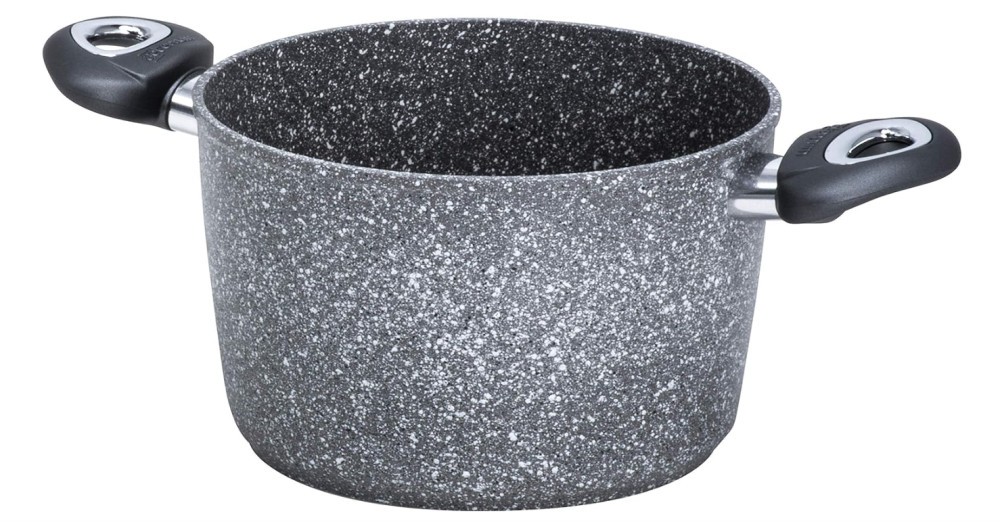 Fabricat cu corp din aluminiu de grosime mare care asigură performanțe excelente de gătit. Învelișul antiaderent este deosebit de durabil și asigură o durată lungă de viață. Prezența microparticulelor de piatră permite un aspect natural, sănătos și fără uleiuri și grăsimi adăugate; datorită mânerului ergonomic din bachelită cu finisaj moale, utilizarea este convenabilă, iar mânerul este ferm și sigur