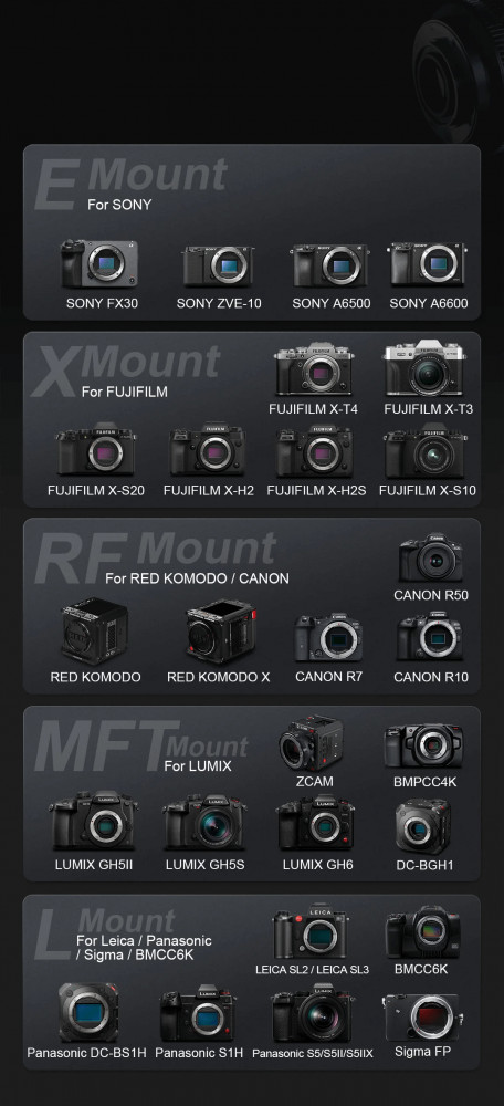 Obiectivul Manual Sirui NightWalker 24mm T1.2 S35 ofera o diafragma maxima ultra-rapida de T1.2 si este conceput pentru a acoperi senzori foto Super35/APS-C, echivaland cu un senzor de 34mm full frame. Sirui Nightwalker 24mm T1.2 prezinta un design compact si usor, cu o calitate a imaginii ridicata, inele zimtate in stil cinematografic si respiratie minima a lentilei (focus breathing). Nuanta culorii, pozitia inelelor si dimensiunea sunt consistente pe toata seria NightWalker, asigurand compatibilitate intre accesorii si permitand schimbari rapide ale obiectivului.