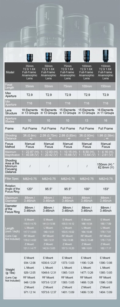 Obiectivul manual Sirui Venus 150mm T2.9 1.6x Full-Frame Anamorphic lens are performante optice cinematice, cu o claritate ridicata si o distorsiune redusa, echivaland cu un obiectiv de 94 mm pe orizontala, este considerat o alegere excelenta pentru portrete, exprimarea emotiilor, fotografii de natura statica, subiecte indepartate. Disponibil pentru monturi Sony E, Canaon RF, Nikon Z si leica L.