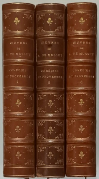 OEUVRES de ALFRED de MUSSET , COMEDIES ET PROVERBES , VOLUMELE I - III , 1875 , LEGATURA DEOSEBITA , COTOR SI COLTARE DIN PIELE *