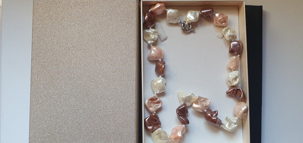 Colier nou perle baroce naturale, extrem de mari , intre 2,5cm si 3cm. Colierul este deosebit de elegant si frumos, format din perle de trei culori, alb, beige-roz si maron. Colierul are lungimea de 64cm si are un sistem de prindere pe masura de elegant, auriu . Colierul este absolut nou, nepurtat si se vinde intr-o cutie foarte eleganta cu finisaj lucios.