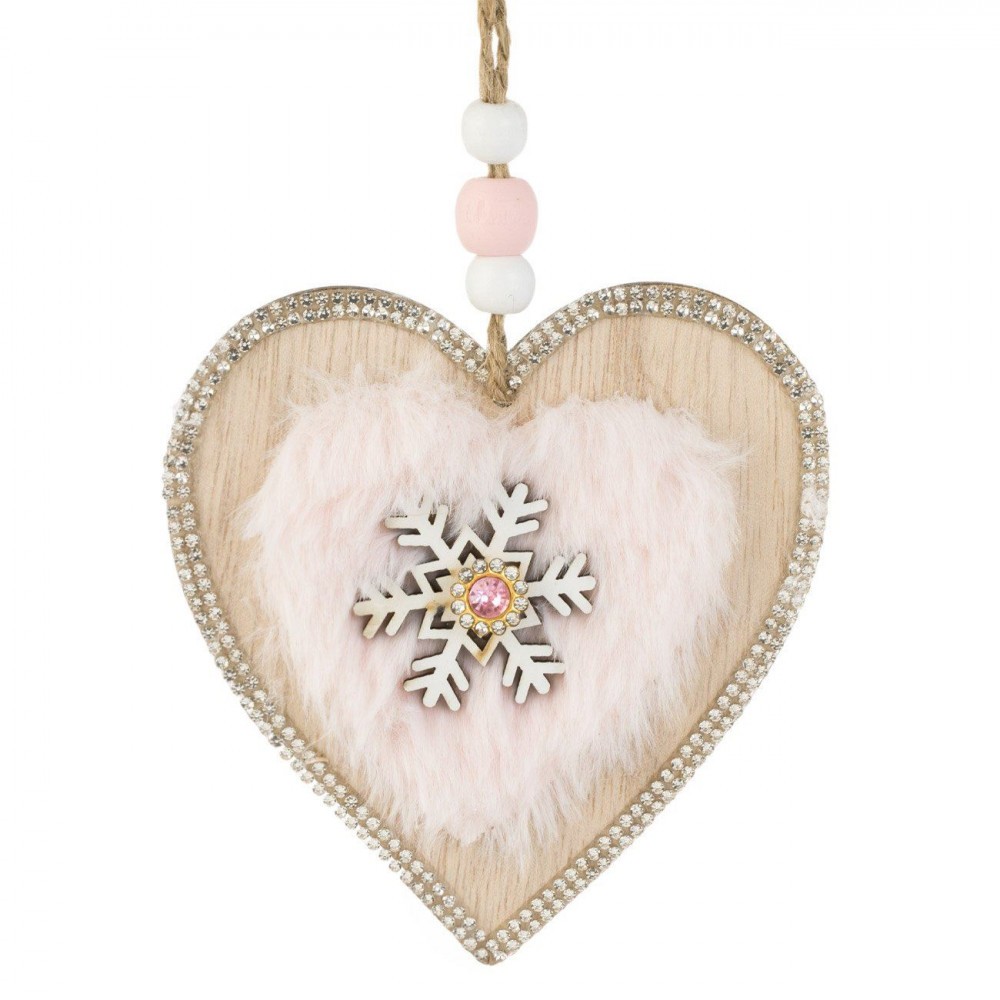 Ornament Crăciun, Inimă Lemn, Roz, Fulgi Zăpadă, Blană