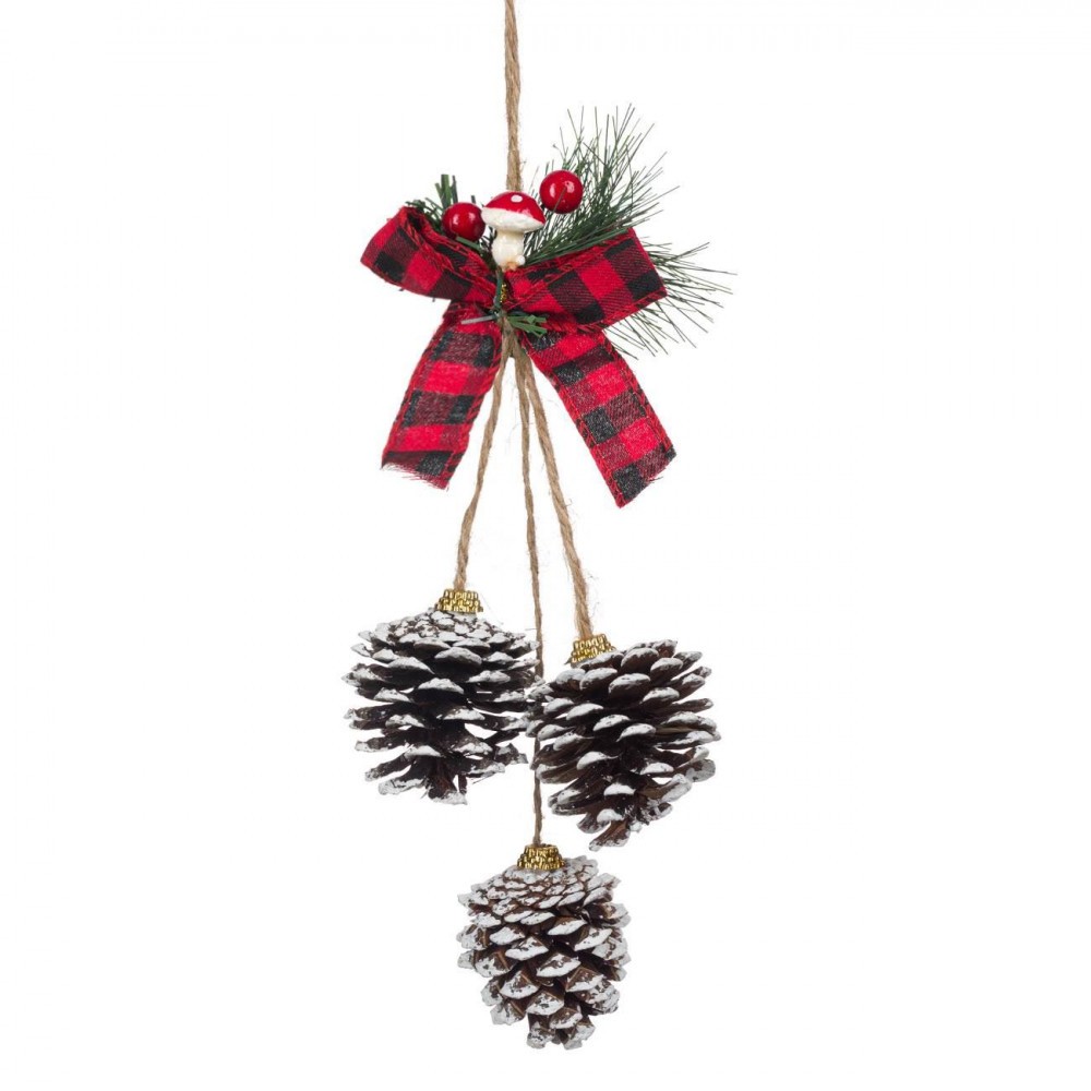 Ornament Decorativ Crăciun, Model Suspendabil, 3 Conuri Ninse, Crenguță și Panglică Carouri, 35cm