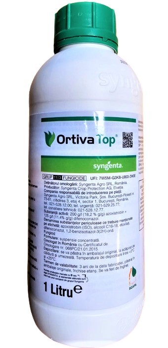 Ortiva Top conţine două ingrediente active (azoxistrobin şi difenoconazol) cu activitate de contact şi sistemică locală şi translaminară.