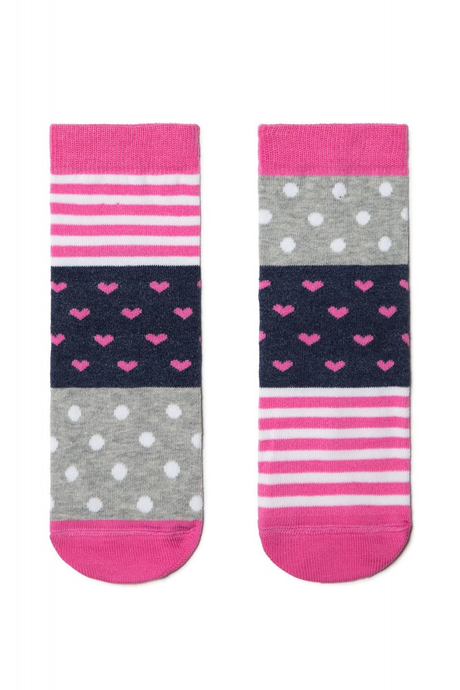 Șosete haioase cu model inimioare și buline pentru copii Conte Kids Funny Legs 282. Șosetele sunt fabricate din bumbac pieptănat, sunt foarte plăcute la atingere, nu se întind și nu pierd din culoare chiar și după mai multe spălări. Produsul are o bună permeabilitate la aer ce permite pielii să respire iar buna higroscopicitate a materialelor face ca pielea să fie mereu uscată.