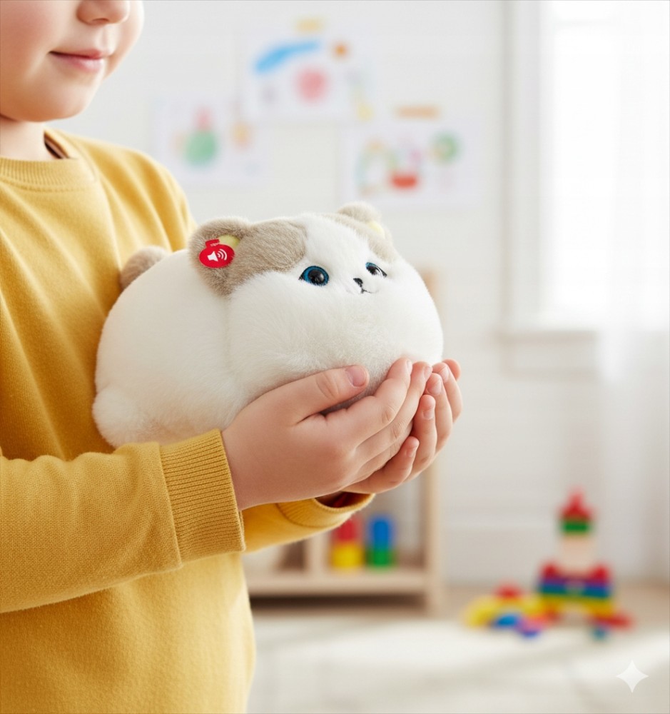 O pisică interactivă din pluș care răspunde la atingere și poate repeta cuvinte!