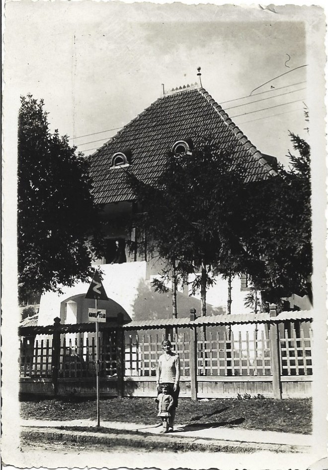 Reclamă la anvelopele Goodyear pe stâlpul indicatorului rutier, Poiana Țapului, perioada interbelică.