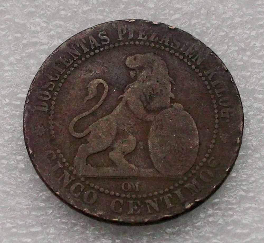 P3. Spania 5 centimos 1870 uzata. MONEDA DIN IMAGINE, IN STAREA PE CARE O PUTETI APRECIA SINGURI.