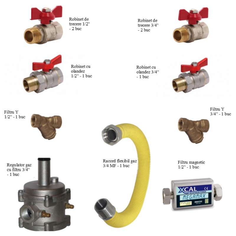 Pachetul contine minimul necesar pentru conectarea hidraulica si conectarea la reteaua de gaz a centralei dumneavoastra.