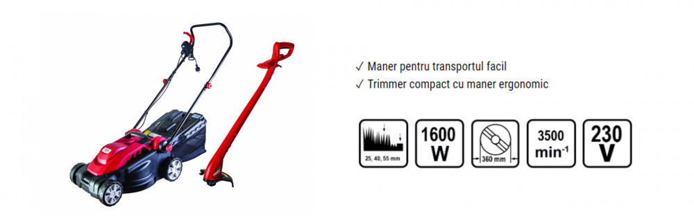 Pachet: Masina de tuns iarba Raider, 1600 W, 360 mm, 35 l + Trimmer pentru gazon Raider, 250 W, 220 mm