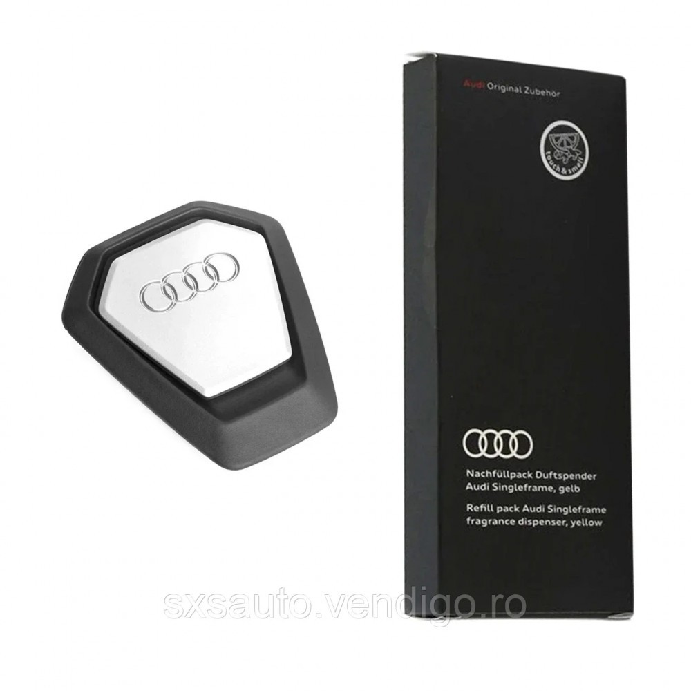 Odorizant auto original Audi oferit acum intr-un design distinct reprezentand noile grile de radiator Audi Singleframe, ofera un parfum reconfortant si stimulant in vehicul. Odorizatorul de aer se fixeaza usor si rapid pe lamelele gurilor de ventilatie gratie sistemului de fixare integrat. Parfumul este furnizat de un stick consumabil fabricat dintr-un polimer cu molecule de parfum integrate ce se elibereaza treptat in aproximativ 45 zile. Intensitatea parfumului se reglaza prin ajustarea insertiei din aluminiu cu logo cercuri Audi. Stick-ul de parfum poate fi indepartat dupa consumare si se inlocuieste cu unul nou.