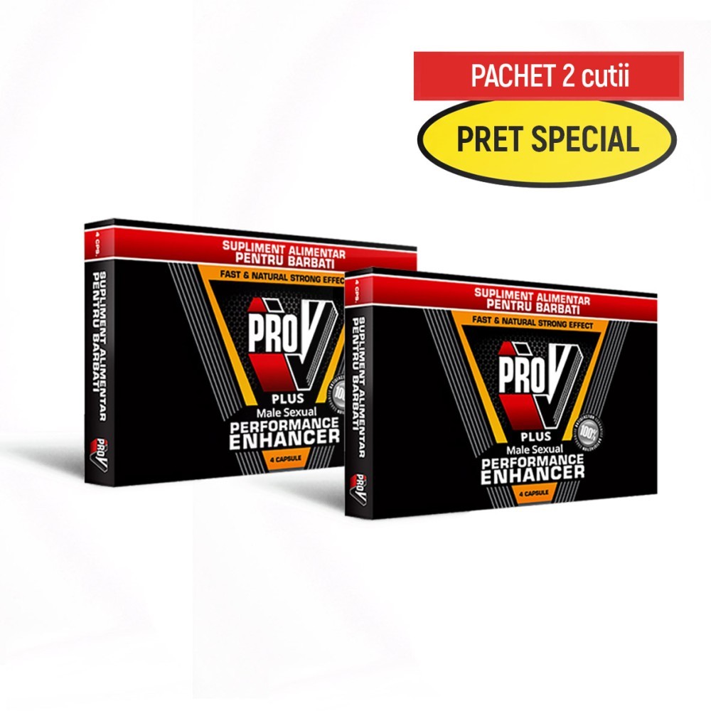 Pachet promotional ce include 2 cutii de pilule pentru potenta Pro V 4 Plus. Acestea sunt un tonic sexual pentru barbati, cu o formula inovatoare pe baza de ingrediente naturale de inalta calitate, ce poate ajuta la imbunatatirea performantelor sexuale prin obtinerea si mentinerea unei erectii ferme. Fata de varianta clasica Pro V 4, care se bazeaza pe o combinatie mai larga de adaptogeni, Pro V 4 Plus inlocuieste anumite ingrediente cum ar fi Ginsengul, extractul de Rodiola si extractul de Goji, cu un ingredient des intalnit in suplimentele alimentare pentru barbati, acesta fiind extractul de radacina de Maca.Prezenta acestui compus in Pro V 4 Plus poate oferi beneficii suplimentare in ceea ce priveste vitalitatea, tonusul si rezistenta. Fiind foarte bogata in nutrienti esentiali, radacina de Maca poate fi un suport in reducerea stresului, cresterea fertilitatii si imbunatatirea starii de spirit in general. Efectele primordiale ale produsului sunt de a stimula functia erectila a barbatilor si de a creste fluxul de sange catre tesuturi, oferind o erectie mult mai ferma si un act sexual mult mai satisfacator. Formula bazata pe ingrediente vegetale poate ajuta la cresterea libidoului dar si la sporirea energiei si vitalitatii in general, oferind un tonus mult mai bun si o stare generala de bine.Pe langa radacina de Maca mentionata anterior, Pro V 4 Plus contine o multitudine de ingrediente naturale, fiind un supliment benefic pentru orice barbat, usor de inghitit si facil de asimilat de catre organism. Pilulele contin Tribulus Terrestris, planta cunoscuta si utilizata de secole in medicina traditionala asiatica pentru cresterea libidoului, fiind un afrodisiac natural cu proprietati tonice. Acesta poate sustine productia de testosteron (cel mai important hormon masculin), afecteaza intr-un mod pozitiv forta erectiei si sustine activitatea sexuala in general.De asemenea, produsul contine scortisoara, adesea folosita in suplimentele alimentare pentru a sprijini activitatea sexuala prin oferirea unul flux mai mare al sangelui la nivel periferic dar si in zona genitala.Astfel, putem spune cu siguranta ca produsul este ideal pentru barbatii care sunt sau care doresc sa devina mult mai activi din punct de vedere sexual, sa imbunatateasca calitatea vietii intime si sa aiba o incredere mai mare in fortele proprii.Mod de administrare: Se administreaza 1 capsula cu un pahar de apa cu aproximativ 30 de minute inaintea activitatii sexuale planificate. Nu se recomanda administrarea a mai mult de o capsula la 3 zile. Pachetul include 2 cutii a cate 4 pilule fiecare. | Cantitate: 4 x 2 cutii