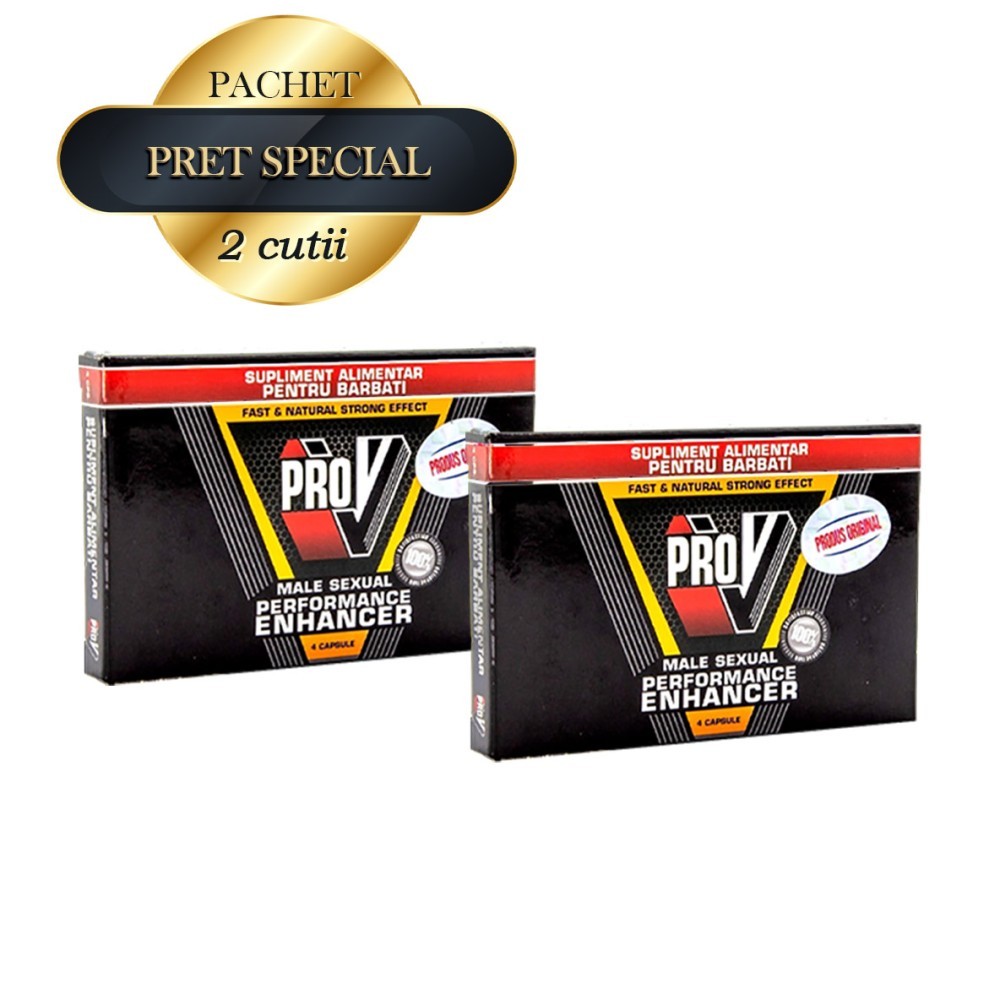 Pachet promotional ce contine 2 cutii de pilule pentru potenta Pro V 4. Acestea reprezinta un tonic sexual special creat pentru barbati, ce ajuta la imbunatatirea actului sexual, a functiilor sexuale dar si la obtinerea si mentinerea unei erectii ferme mai mult timp.Formula bazata pe ingrediente naturale de inalta calitate poate ajuta la cresterea libidoului dar si la sporirea energiei si vitalitatii in general, oferind un tonus mult mai bun si o stare generala de bine.Efectele primordiale ale produsului sunt de a stimula functia erectila a barbatilor si de a creste fluxul de sange catre tesuturi, oferind o erectie mult mai ferma si un act sexual mult mai satisfacator. Pro V 4 contine o multitudine de ingrediente naturale, fiind un supliment benefic pentru orice barbat, usor de folosit si facil de asimilat de catre organism. Pilulele contin Tribulus Terrestris, un afrodisiac natural cu proprietati tonice, care poate sustine productia de testosteron (cel mai important hormon masculin). Astfel, Tribulus Terrestris (denumit popular si coltii babei) afecteaza intr-un mod pozitiv forta erectiei si activitatea sexuala in general.De asemenea, produsul contine Ginseng si scortisoara, adesea folosite in suplimentele alimentare pentru a sprijini activitatea sexuala si pentru a mari fluxul sanguin. Ginsengul este un tonic general si energizant ce ajuta la reducerea oboselii si extenuarii, creste fertilitatea masculina si productia de lichid seminal, contribuind astfel intr-un mod benefic la o viata intima normala. Astfel, putem spune cu siguranta ca produsul este ideal pentru barbatii care sunt sau care doresc sa devina mult mai activi din punct de vedere sexual si sa imbunatateasca calitatea vietii intime.Mod de administrare: Se administreaza 1 capsula cu un pahar de apa, cu aproximativ 30 de minute inaintea inceperii actului sexual. Nu se recomanda administrarea a mai mult de o capsula la 3 zile. Pachetul promotional include 2 cutii a cate 4 capsule fiecare. Mai multe detalii gasiti aici. | Cantitate: 8 capsule