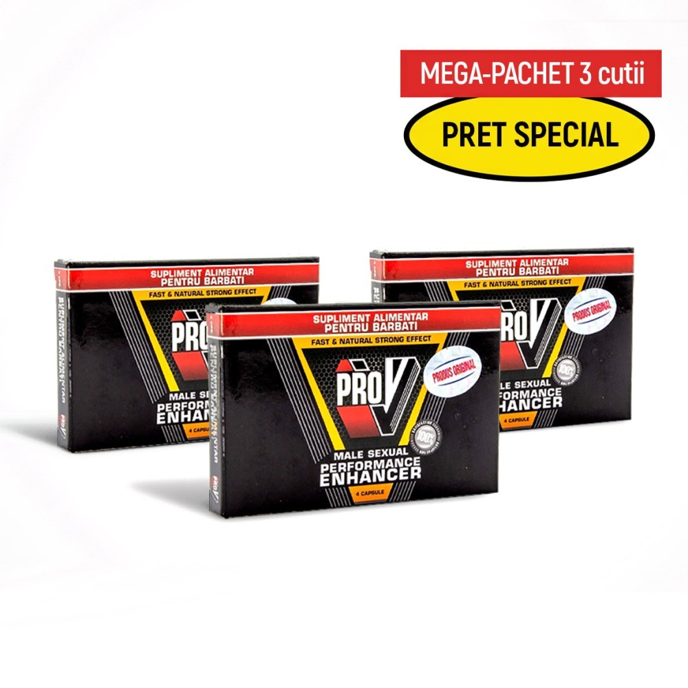 Pachet promotional ce contine 3 cutii de pilule pentru potenta Pro V 4. Acestea reprezinta un tonic sexual special creat pentru barbati, ce ajuta la imbunatatirea actului sexual, a functiilor sexuale dar si la obtinerea si mentinerea unei erectii ferme mai mult timp.Formula bazata pe ingrediente naturale de inalta calitate poate ajuta la cresterea libidoului dar si la sporirea energiei si vitalitatii in general, oferind un tonus mult mai bun si o stare generala de bine.Efectele primordiale ale produsului sunt de a stimula functia erectila a barbatilor si de a creste fluxul de sange catre tesuturi, oferind o erectie mult mai ferma si un act sexual mult mai satisfacator. Pro V 4 contine o multitudine de ingrediente naturale, fiind un supliment benefic pentru orice barbat, usor de folosit si facil de asimilat de catre organism. Pilulele contin Tribulus Terrestris, un afrodisiac natural cu proprietati tonice, care poate sustine productia de testosteron (cel mai important hormon masculin). Astfel, Tribulus Terrestris (denumit popular si coltii babei) afecteaza intr-un mod pozitiv forta erectiei si activitatea sexuala in general.De asemenea, produsul contine Ginseng si scortisoara, adesea folosite in suplimentele alimentare pentru a sprijini activitatea sexuala si pentru a mari fluxul sanguin. Ginsengul este un tonic general si energizant ce ajuta la reducerea oboselii si extenuarii, creste fertilitatea masculina si productia de lichid seminal, contribuind astfel intr-un mod benefic la o viata intima normala. Astfel, putem spune cu siguranta ca produsul este ideal pentru barbatii care sunt sau care doresc sa devina mult mai activi din punct de vedere sexual si sa imbunatateasca calitatea vietii intime.Mod de administrare: Se administreaza 1 capsula cu un pahar de apa, cu aproximativ 30 de minute inaintea inceperii actului sexual. Nu se recomanda administrarea a mai mult de o capsula la 3 zile. Pachetul promotional include 3 cutii a cate 4 pilule fiecare. Mai multe detalii gasiti aici. | Cantitate: 4 x 3 cutii
