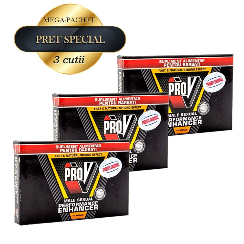 Pachet promotional ce contine 3 cutii de pilule pentru potenta Pro V 4. Acestea reprezinta un tonic sexual special creat pentru barbati, ce ajuta la imbunatatirea actului sexual, a functiilor sexuale dar si la obtinerea si mentinerea unei erectii ferme mai mult timp.Formula bazata pe ingrediente naturale de inalta calitate poate ajuta la cresterea libidoului dar si la sporirea energiei si vitalitatii in general, oferind un tonus mult mai bun si o stare generala de bine.Efectele primordiale ale produsului sunt de a stimula functia erectila a barbatilor si de a creste fluxul de sange catre tesuturi, oferind o erectie mult mai ferma si un act sexual mult mai satisfacator. Pro V 4 contine o multitudine de ingrediente naturale, fiind un supliment benefic pentru orice barbat, usor de folosit si facil de asimilat de catre organism. Pilulele contin Tribulus Terrestris, un afrodisiac natural cu proprietati tonice, care poate sustine productia de testosteron (cel mai important hormon masculin). Astfel, Tribulus Terrestris (denumit popular si coltii babei) afecteaza intr-un mod pozitiv forta erectiei si activitatea sexuala in general.De asemenea, produsul contine Ginseng si scortisoara, adesea folosite in suplimentele alimentare pentru a sprijini activitatea sexuala si pentru a mari fluxul sanguin. Ginsengul este un tonic general si energizant ce ajuta la reducerea oboselii si extenuarii, creste fertilitatea masculina si productia de lichid seminal, contribuind astfel intr-un mod benefic la o viata intima normala. Astfel, putem spune cu siguranta ca produsul este ideal pentru barbatii care sunt sau care doresc sa devina mult mai activi din punct de vedere sexual si sa imbunatateasca calitatea vietii intime.Mod de administrare: Se administreaza 1 capsula cu un pahar de apa, cu aproximativ 30 de minute inaintea inceperii actului sexual. Nu se recomanda administrarea a mai mult de o capsula la 3 zile. Pachetul promotional include 3 cutii a cate 4 capsule fiecare. Mai multe detalii gasiti aici. | Cantitate: 12 capsule
