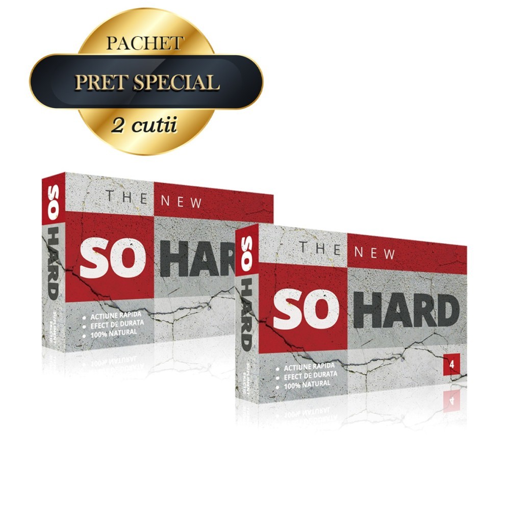 Pachet promotional ce include 2 cutii de pilule So Hard, special create pentru barbatii care doresc obtinerea si mentinerea unei erectii puternice un timp mai indelungat. Cu o formula pura si 100% naturala, pilulele sunt ideale daca va doriti o imbunatatire a circulatiei sangelui, daca doriti sa combateti disfunctiile erectile si deopotriva sa va sustineti organismul viguros si energic. Efectul unei pilule dureaza pana la 3 zile, fiind un supliment nutritiv natural ce ofera o energie sexuala crescuta, va poate ajuta sa combateti ejacularea prematura si va poate oferi o dorinta mult mai intensa in ceea ce priveste atractia fata de partenera dumneavoastra.Compozitia pilulelor se bazeaza pe un amestec de plante atent selectionate de inalta calitate, cunoscute pentru beneficiile lor in ceea ce priveste diferite probleme de erectie si cunoscute totodata pentru aportul lor la starea generala de bine. Un ingredient important al produsului il reprezinta Ginsengul. Acesta este un tonic general si energizant ce ajuta la reducerea oboselii si extenuarii, poate creste fertilitatea masculina si productia de lichid seminal, contribuind astfel intr-un mod benefic la o viata intima normala. Ginsengul poate creste energia, vitalitatea si ajuta la intensificarea dorintei sexuale, oferindu-va un libido mult mai crescut. Pilulele So Hard sunt alegerea ideala daca va doriti cresterea libidoului intr-un mod natural, un tonus mult mai ridicat si performante intime mai satisfacatoare. Mod de administrare: Se administreaza 1 capsula de So Hard cu 45-60 minute inainte de actul sexual, iar efectul ei dureaza pana la 72 ore. Nu este recomandat sa luati mai mult de 1 capsula la 3 zile. Se recomanda administrarea de So Hard pe o perioada mai indelungata pentru ca acesta sa va poate ajuta in cazuri de disfunctie erectila, mentinand crescuta dorinta sexuala si obtinand performante sexuale optime. Pachetul include 2 cutii a cate 4 pilule fiecare. | Cantitate: 8 capsule