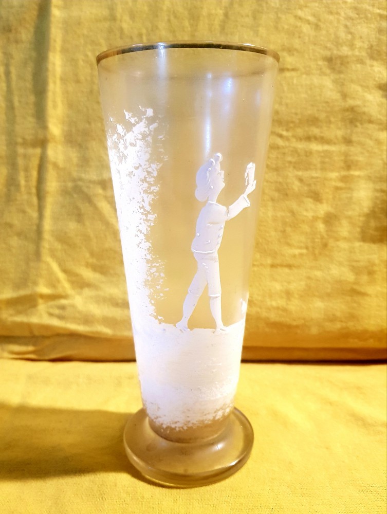 Pahar din sticla pictat manual cu email-Mary Gregory-Boemia cca 1920-inaltime 17 centimetri-diametru la gura 7 centimetri- stare buna de conservare, rog apreciere dupa fotografii.