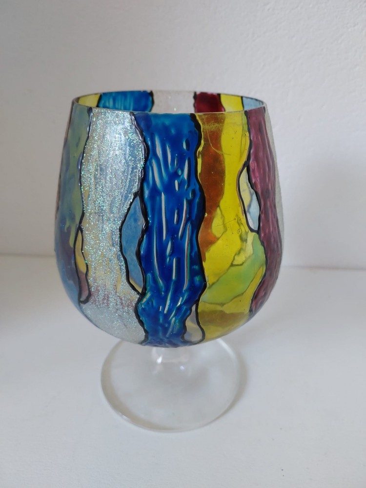 Pahar tip cupa, de sticla, art deco, tip vitraliu, decorat in 4 culori, 16cm inaltime