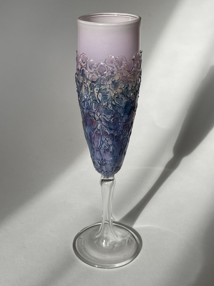 Această piesă unică este un Pahar de șampanie din sticlă artistică texturată , cu un design gradient care se estompează de la o nuanță deschisă de lavandă sau roz-violet la margine la un albastru intens și violet la bază. Baza texturată îi conferă un aspect distinct, adesea creată folosind un model de rășină sau ca o piesă suflată manual.