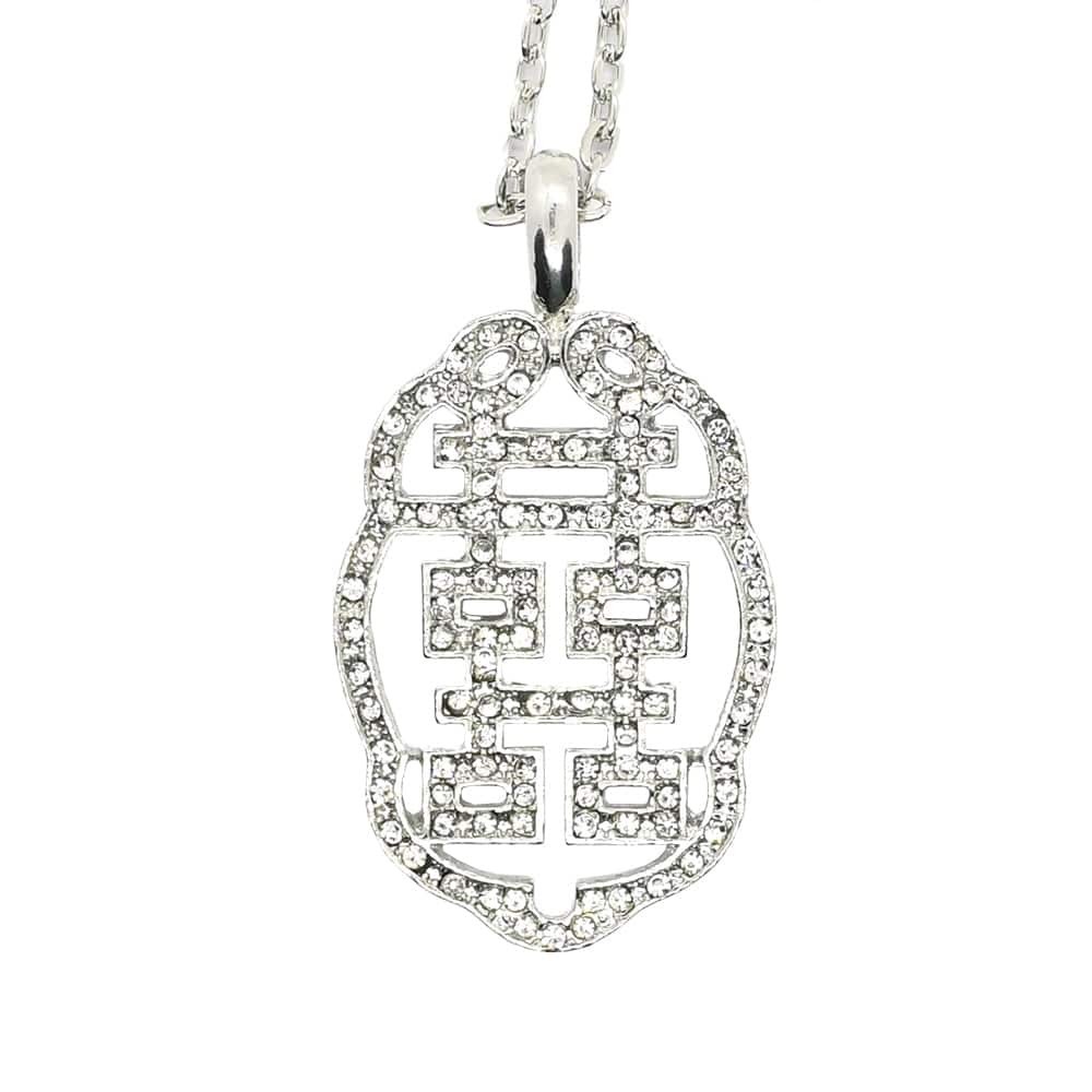 Aceasta este un pandantiv Feng Shui cu simbolul dubla fericire realizat din metal argintiu cu strasuri.