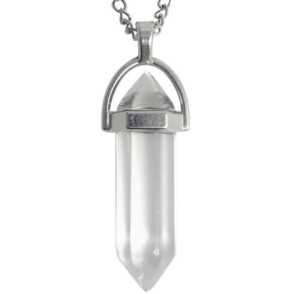 Colierul cu pandantiv cuarț cristal de stâncă este confecționat din cristal natural hexagonal șlefuit cu lungime de 34 mm, cu agățătoare din metal comun și lănțisor din oțel inoxidabil 316 L de culoare argintie cu lungimea de 50 cm