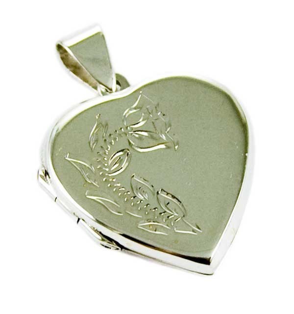 Pandantiv medalion pentru poza in forma de inima, realizat din argint 925, cu un superb design romantic din frunze ?i flori pe capac.