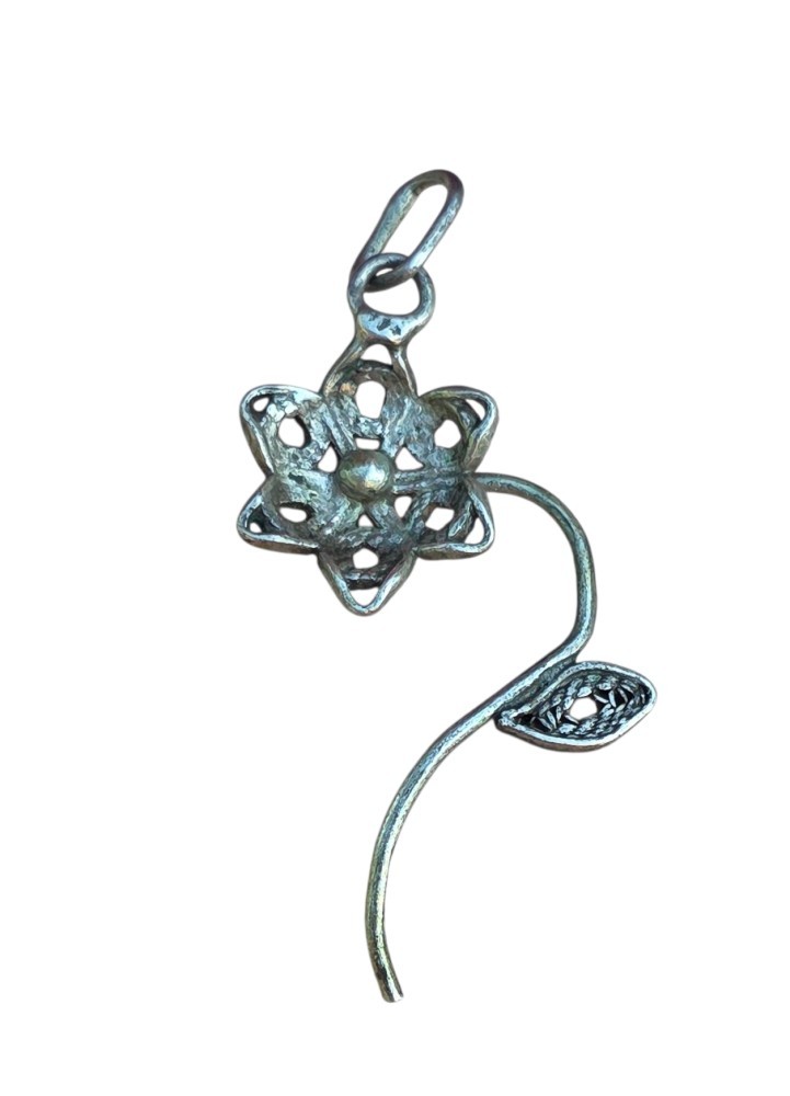 Pandantiv vintage din argint fin lucrat manual, model floare stilizată cu șase petale și o tulpină arcuită, decorată cu o frunză filigranată.