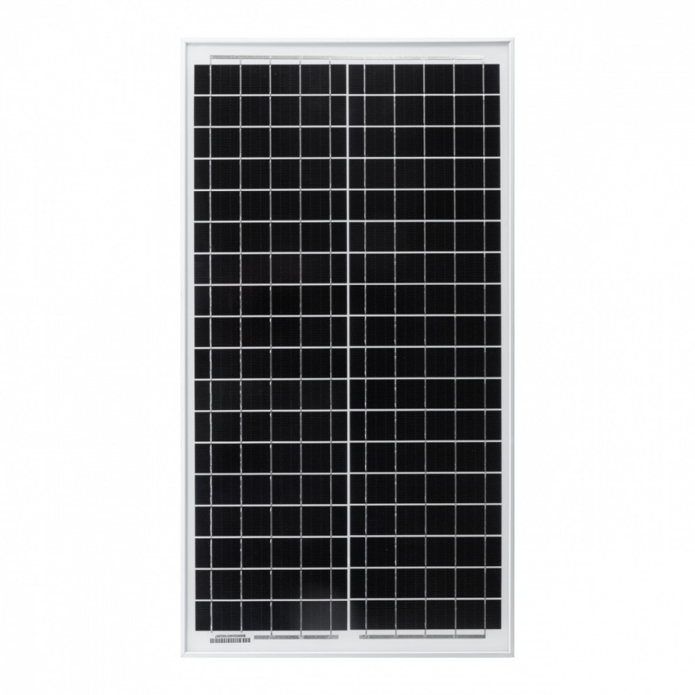 Panou solar monocristalin cu putere de 30 W. Panoul solar transformă energia solară în curent electric. Se montează orientat spre sud, înclinat în 45 grade. Se poate fixa prin intermediul orificiilor aflate pe chenarul de aluminiu. Atenție, panoul solar nu se leagă direct la acumulator! Pentru încărcarea unui acumulator a se utiliza un regulator de încărcare. Specificații Tip celuleMonocristalinPutere maximă30 WVmp18,2 VImp1,65 AVOC21,6 VISC1,84 ADimensiuni670 × 350 × 25 mm