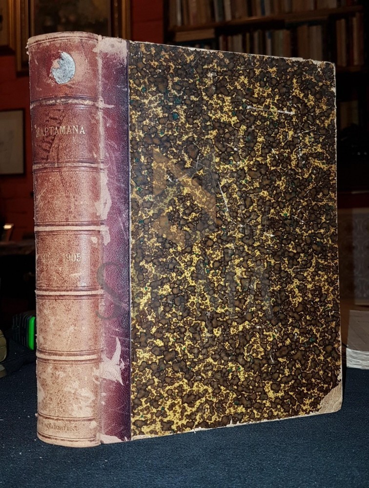 COLEGAT IN FORMAT MEDIU, CONTINE: PANU GEORGE "SAPTAMANA": ANUL II, 1903, 19 NUMERE; PANU GEORGE "SAPTAMANA": ANUL II, 1903, NUMARUL 57; PANU GEORGE "SAPTAMANA": ANUL III, 1904, 10 NUMERE (58 - 67); PANU GEORGE "SAPTAMANA": ANUL III, 1904, 4 NUMERE (74 - 77); PANU GEORGE "SAPTAMANA": ANUL III, 1904, 4 NUMERE (79 - 82); PANU GEORGE "SAPTAMANA": ANUL IV, 1904, DOUA NUMERE (89 - 90); PANU GEORGE "SAPTAMANA": ANUL IV, 1905, NUMARUL 93; PANU GEORGE "SAPTAMANA": ANUL IV, 1905, DOUA NUMERE (97 - 98); PANU GEORGE "SAPTAMANA": ANUL IV, 1905, 4 NUMERE (100 - 103); PANU GEORGE "SAPTAMANA": ANUL IV, 1905, 14 NUMERE (105 - 118); PANU GEORGE "SAPTAMANA": ANUL V, 1905, 3 NUMERE (119 - 121); PANU GEORGE "SAPTAMANA": ANUL V, 1905, 5 NUMERE (123 - 127). IN TOTAL 69 NUMERE DIN PERIODICUL "SAPTAMANA". IN COPERTA VECHE (COTOR DIN PIELE), STARE FOARTE BUNA.