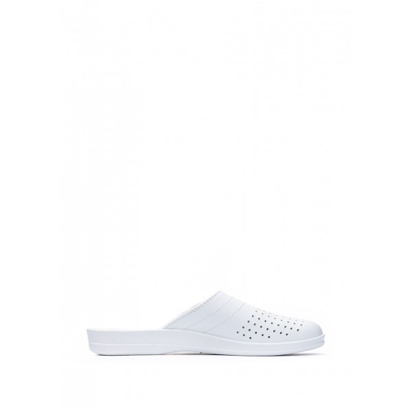 Papuci din piele artificială care îndeplinesc condițiile de bază de protecție a muncii pentru instituțiile medicale, companiile de curățenie, lucrătorii din industria alimentară și alte întreprinderi. Față din imitație de piele cu acoperire PU, talpă turnată din PVC ușor cu strat anti-derapanteÎncălțămintea medicală Tellus combină funcționalitatea ridicată echilibrată cu estetica și confortul. Produsele sunt realizate din materiale respirabile, cu orificii suplimentare de aerisire care sustin schimbul constant de aer - favorabil sanatatii pielii picioarelor, iar talpa este protejata de alunecare. Drept urmare, sabotii dobândesc toți parametrii necesari de calitate, funcționalitate și durabilitate.Lungime branț 40-26.5cm, 41-27cm, 42-27.5cm, 43-28cm, 44-28.5cm, 45-29cm, 46-29.5cm
