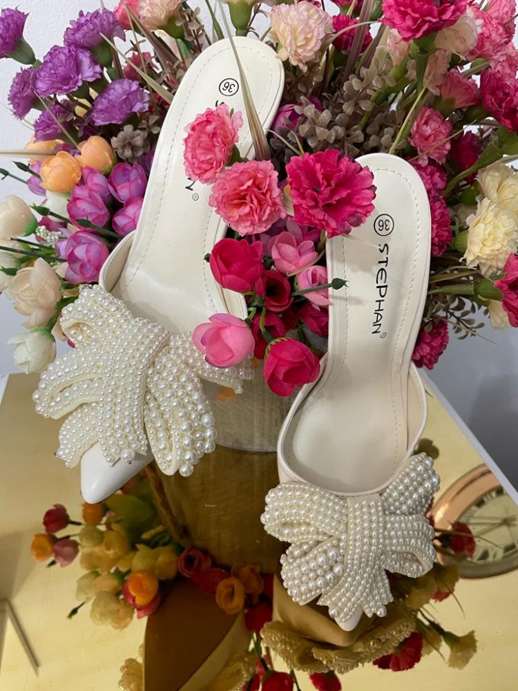 Pantofi eleganti dama din piele ecolodica, prevazuti cu perle satinate in forma de funda. Piele ecologica Accesorizati cu perle Toc stabil, usor ingrosat spre flec Toc: 11cm