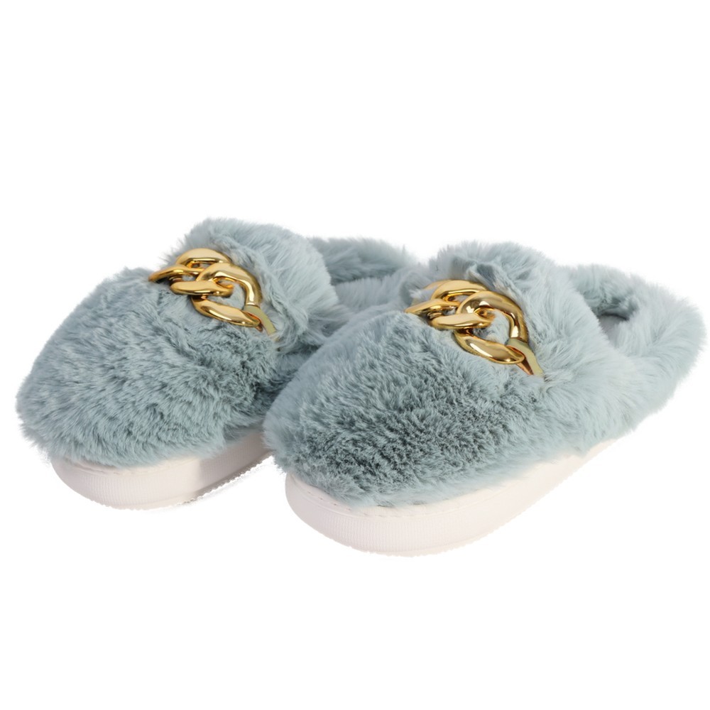 Papuci de Casa Femei - PufosI cu Catarama Aurie, Marime 38-39, Vernil