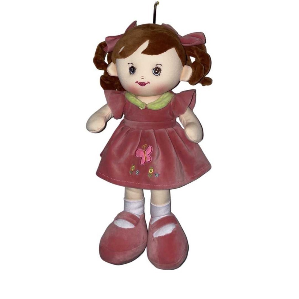 Papusa din plus cu par din material plusos. Aceasta are rochita si bluza culoare violet cu un fluturas brodat in partea de jos. Inaltimea este de 40 de cm si canta in romaneste : ingerasul meu