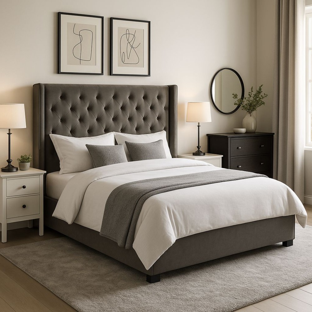 Tăblia înaltă, capitonată cu butoni decorativi, oferă un aer