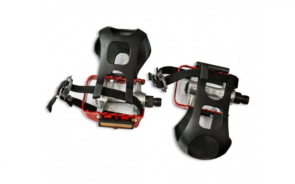 Pedale Aluminiu cu Ratrape plastic, 869LC, rama otel, curea Nylon, Ax CrMo 9/16, ARG / ROSU