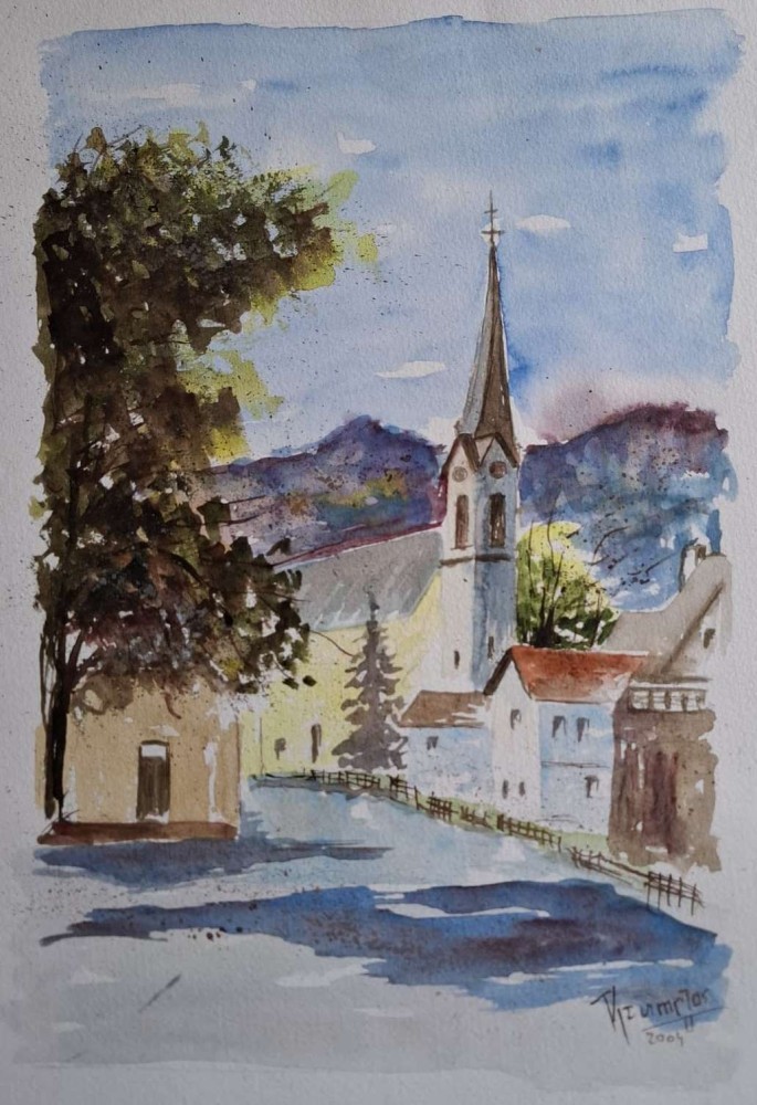 Peisaj cu biserică, acuarelă semnată şi datată (2004)
