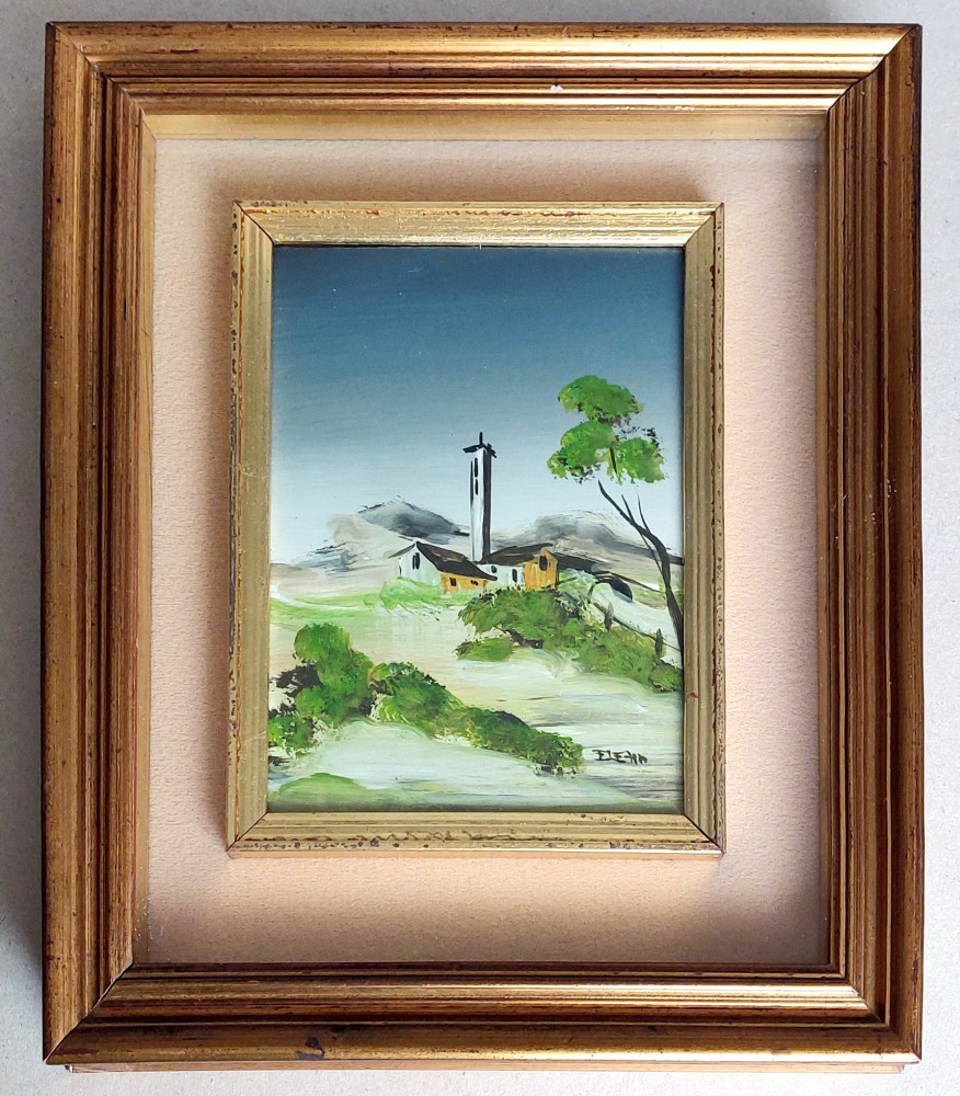 Peisaj cu turn - tablou original cu passepartout ulei pe carton 28x34cm