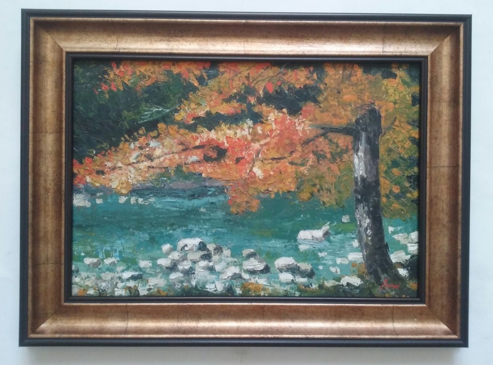 Pictura in ulei pe carton, semnata dreapta jos I. Apopei si insotita de o dedicatie pe verso. Lucrarea este incadrata in rama cu dimensiuni exterioare de 33 x 43,5 cm, in stare buna. Reda un peisaj linistit, realizat in tonuri calde si armonioase.