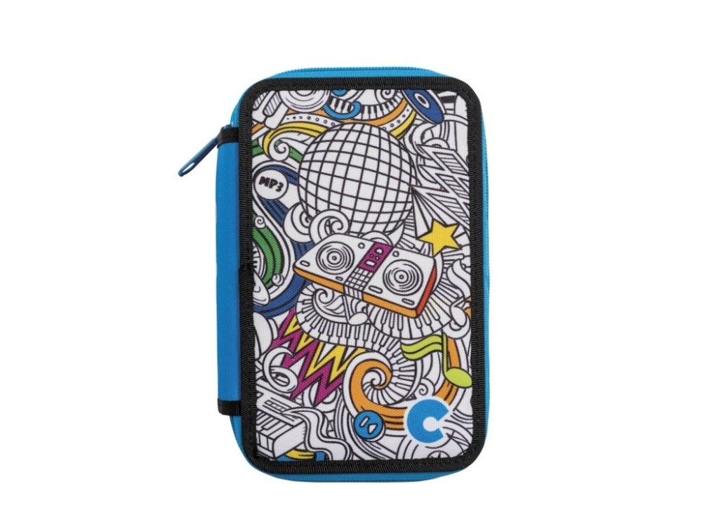 Penar clasic, cu 3 fermoare. Contine: 1 marker Carioca FABRIC LINER, pentru colorarea si personalizarea partii superioare 18 carioci Joy, in tot atatea culori, cu varf fin 18 creioane colorate Tita, in tot atatea culori 1 creion grafit HB 1 rigla 1 radiera alba 1 ascutitoare 1 roller Carioca Oops Pop cu cerneala speciala, termosensibila, ce dispare prin frecarea cu capatul celalalt al roller-ului 1 pix Corvina