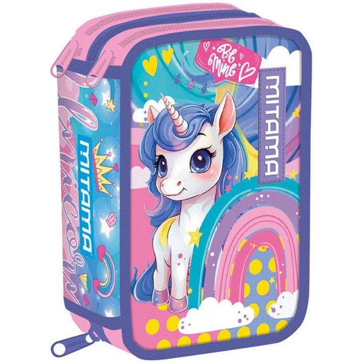 Penarul echipat Mitama cu design unicorn are trei compartimente spatioase, fiind practic si atractiv pentru organizarea accesoriilor scolare.