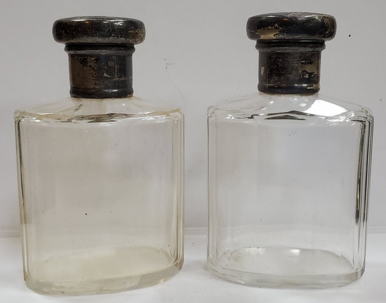 Pereche de recipiente din sticla si capace din argint.