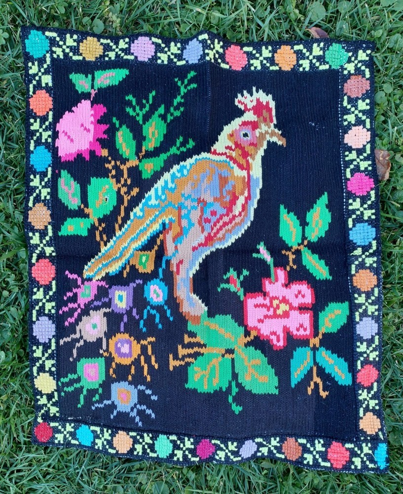 Peretar vechi cusatura pe etamina, cu papagal si flori viu colorate, anii 60-70, Romania, cusatura kilim, chlim