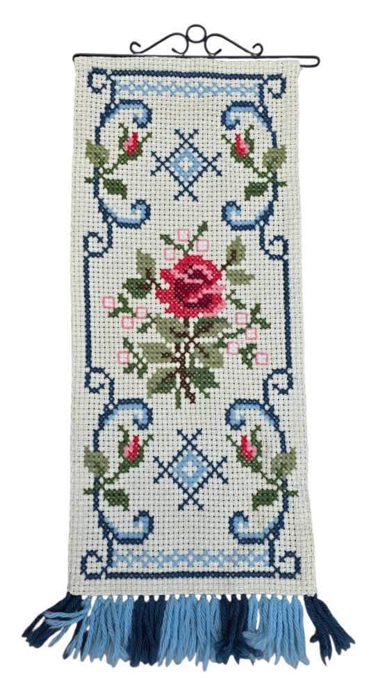 Peretar vintage cusut manual prin tehnica punctului în cruce, pe suport din etamină de culoare ivoire. Marginea inferioară este finisată cu ciucuri groși în degradeuri de albastru, iar partea superioară este prevăzută cu un suport metalic ornamental pentru agățare.