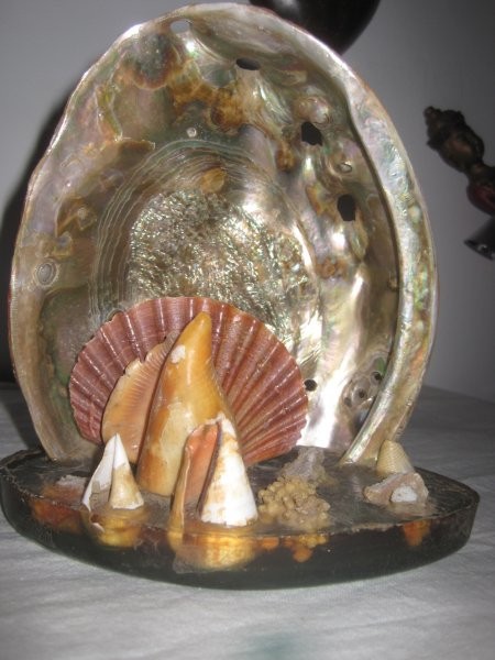 Perlamutr ,fantezia oceanului , coral , scoici , melci , la un loc . Dimensiuni 18 X 16,5 X 11,5 cm .