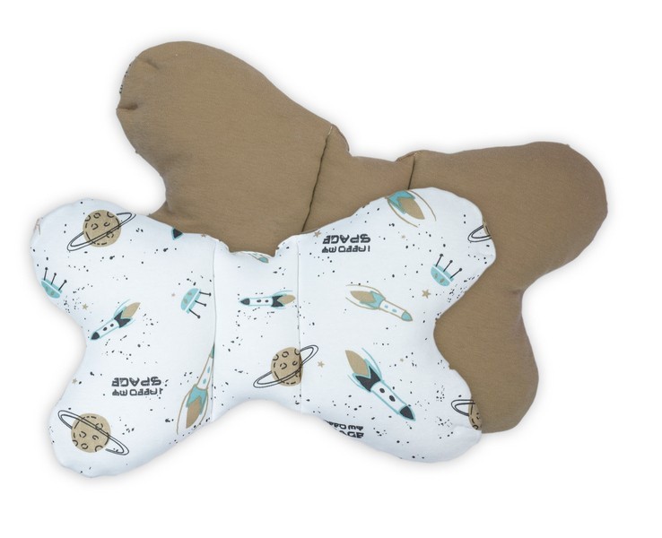 Perna confortabila si placuta la atingere. Pe o parte este realizata din material alb cu motive spatiale, iar pe cealalta parte este maro deschis. Umplutura este realizata din puf antialergic 100% sigur pentru copil. DATE TEHNICE: Dimensiuni: 38x25 cm (14 cm la mijloc)Material: Bumbac 100%;Produs in: Polonia